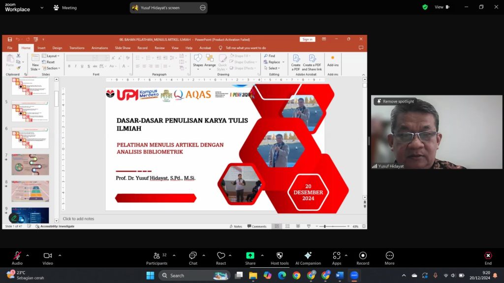 Pelatihan dimulai pada Jumat, 20 November, dengan sesi pembukaan oleh Anisa Eka. Pada sesi pertama, Prof. Dr. Yusuf Hidayat, M.Si membahas dasar-dasar penulisan karya tulis ilmiah serta pentingnya menjaga originalitas dalam tulisan. Setelah istirahat salat Jumat, pelatihan dilanjutkan oleh Dwi Fitria Al Husaeni, S.Pd., M.Pd., yang memaparkan cara pengumpulan data, penggunaan software VOSviewer, serta praktik langsung analisis bibliometrik.